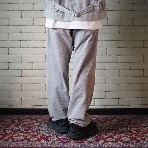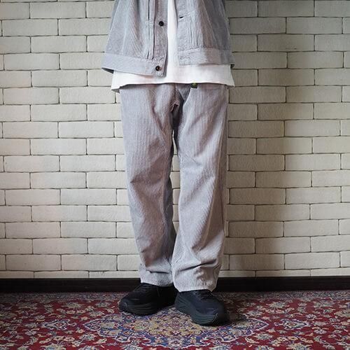 GOHEMPが得意とするトラディショナルな縫製はしっかり押さえつつ、ウェビングベルトやガゼットクロッチを採用することでハードな印象を緩和し、現代的なデザインにアレンジしています。腰周りやワタリにゆとりを持たせ、弱めのテーパード効かせたルーズシルエットです。